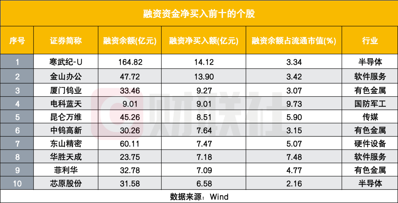 寒武纪-U以14.12亿元的融资净买入额位居首,融资余额达164.82亿元;金山办公净买入13.90亿元;昆仑万维作为传媒板块代表,净买入8.51亿元,位列第五。此外,有色金属、国防军工板块也有个别标的跻身净买入前十,厦门钨业、电科蓝天分别以9.27亿元、9.01亿元的净买入额上榜,资金对细分赛道的布局特征显著。