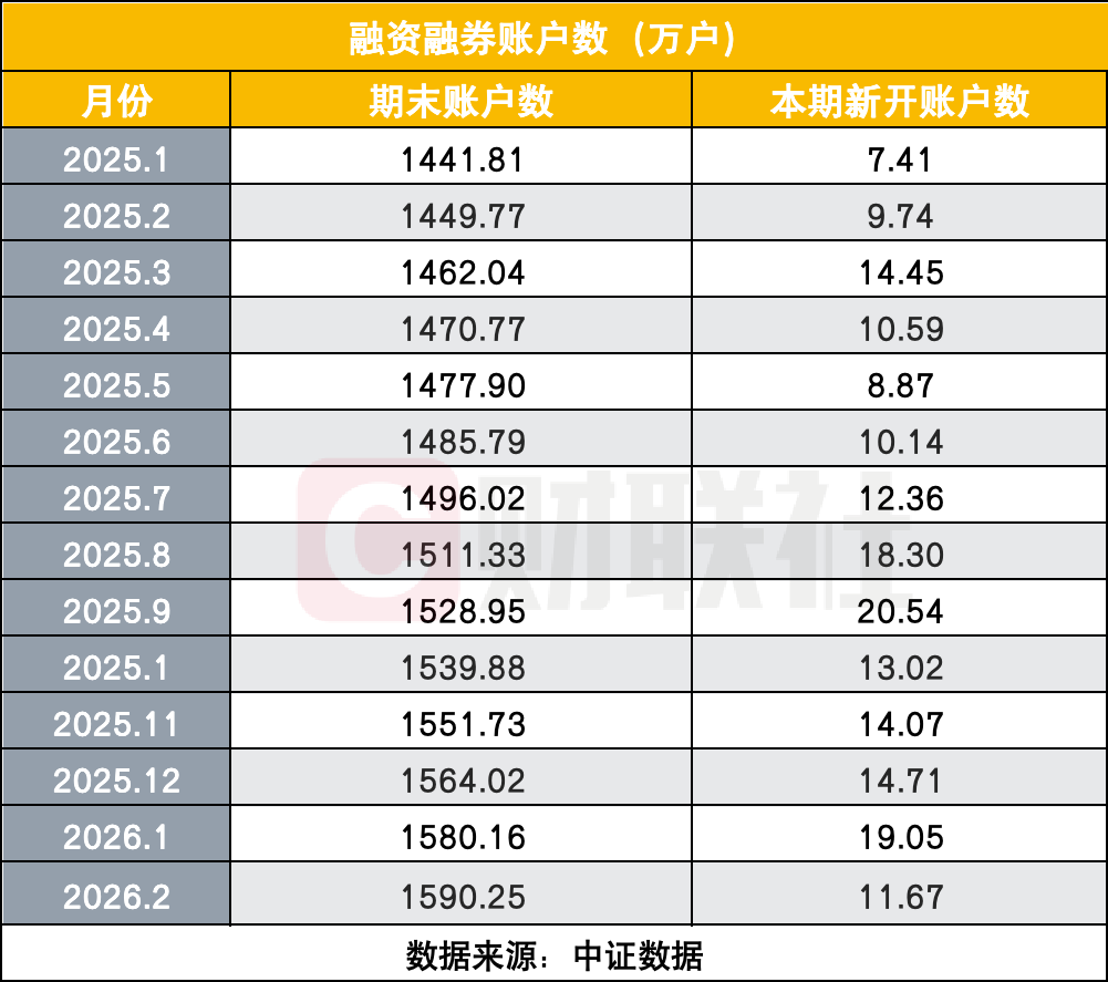 从两融账户总量来看,期末账户数保持稳步增长,2026年2月两融期末账户数达1590.25万户,较1月的1580.16万户继续增加,两融市场的整体规模仍在稳步扩容。