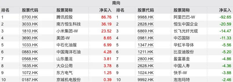 大幅净卖出:阿里巴巴-W(09988.HK)6.30亿港元;中芯国际(00981.HK)5.99亿港元;比亚迪股份(01211.HK)5.20亿港元; 长飞光纤光缆(06869.HK)3.33亿港元;小米集团-W(01810.HK)1.60亿港元;中国海洋石油(00883.HK)1.37亿港元。