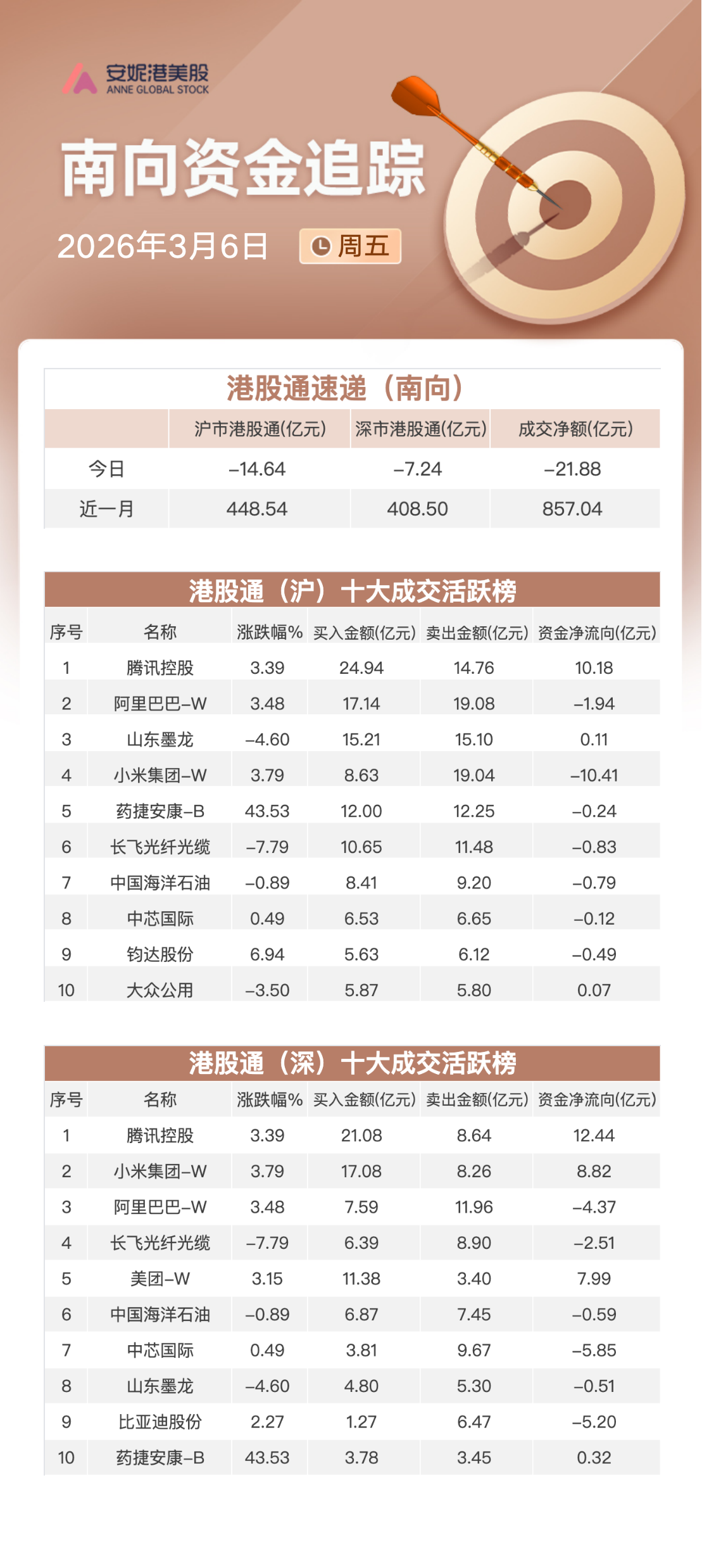 周五,南向资金净流出约21.88亿港元,其中沪港股通净流出约14.64亿港元,深港股通净流出约7.24亿港元。