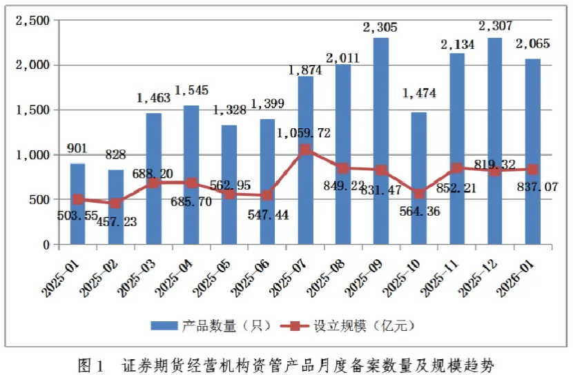 今年1月,证券期货经营机构共备案私募资管产品2065只,环比减少10.49%,同比增加129.19%;设立规模837.07亿元,环比增加2.17%,同比增加66.23%。去年12月,私募资管产品备案2307只,设立规模819.32亿元。
