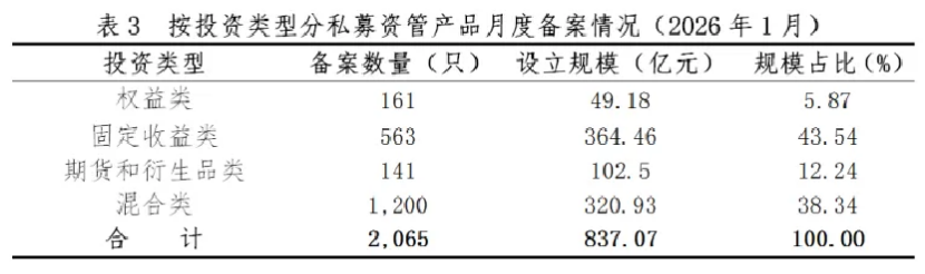 从投资类型看,1月备案的混合类产品数量最多,固定收益类产品设立规模最大。