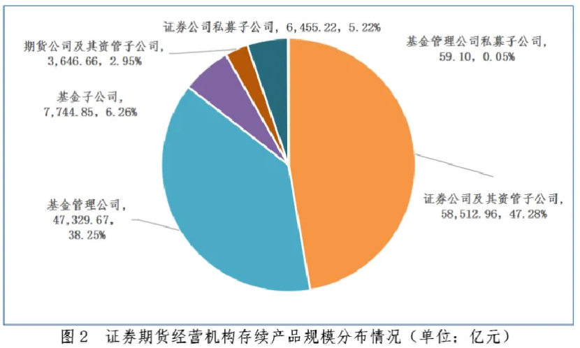 其中,证券公司及资管子公司、基金管理公司、基金子公司、证券公司私募子公司、期货公司及资管子公司、基金管理公司私募子公司的私募资管存续规模分别为5.85万亿元、4.73万亿元、7744.85亿元、6455.22 亿元、3646.66亿元、59.1亿元,规模占比依次为47.28%、 38.25%、6.26%、5.22%、2.95%、0.05%。