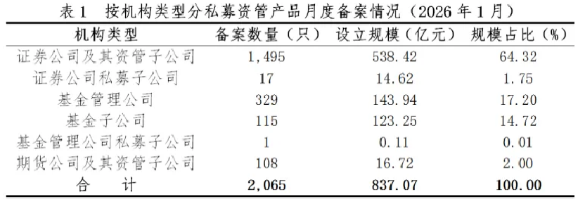 从机构类型看,今年1月备案的私募资管产品中,证券公司及子公司产品占比最高,其他机构与之差距显著。
