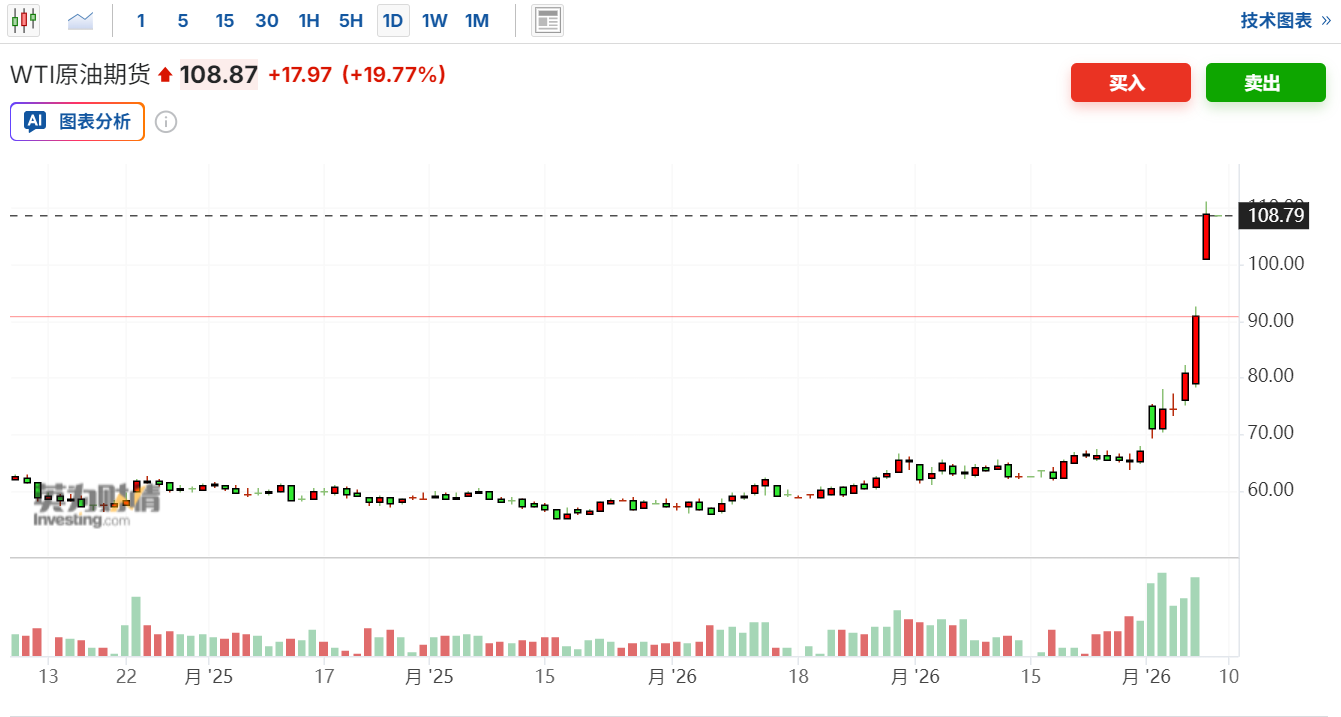WTI原油期货向上触及110美元/桶,最新报111.0美元/桶,日内上涨22.11%。布伦特原油期货向上触及110美元/桶,最新报110.263美元/桶,日内上涨18.96%。而上一次油价突破每桶100美元大关,还是在2022年俄乌冲突爆发之后。