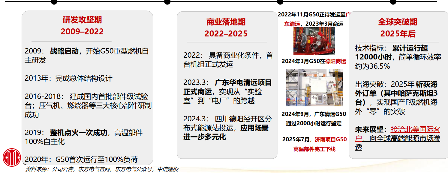 当前东方电气完全自主燃机产品线中,G50为最成熟产品,已在广东清远、四川德阳投入运行,累计投入商运超12000小时,G15已通过满负荷运行试验;G80(80MW)、G200(200MW)研发中;G50稳定性与可靠性获得充分验证,远超尚处于样机验证或点火初期阶段的竞品,领先同行至少3-4年。