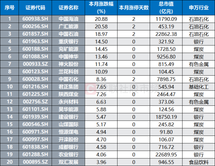 从成分股上看,以中证红利成分股统计,累计共有15股月涨幅在5%以上。其中,中国海油、广汇能源、中国石油、重庆银行、兖矿能源涨幅居前,分别上涨近20.9%、20.6%、19.0%、14.5%、14.4%。按行业板块统计,月涨幅居前的20只中证红利成分股中,煤炭股占比较高,比例近4成,石油石化、银行股数量也相对较多。