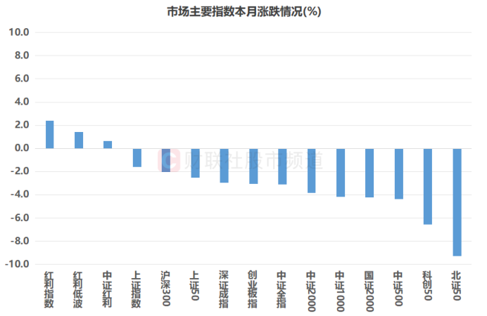 进入本月以来,A股整体呈现跌多涨少的态势,截至今日收盘,全市场个股近6个交易日平均下跌3.5%,中位数跌幅4.3%。从指数层面来看,北证50、科创50在本月跌幅明显,幅度分别达9.3%、6.6%,而红利指数唯一飘红,月内涨幅达2.4%,上证指数、沪深300、上证50等指数月内跌幅相对靠后。