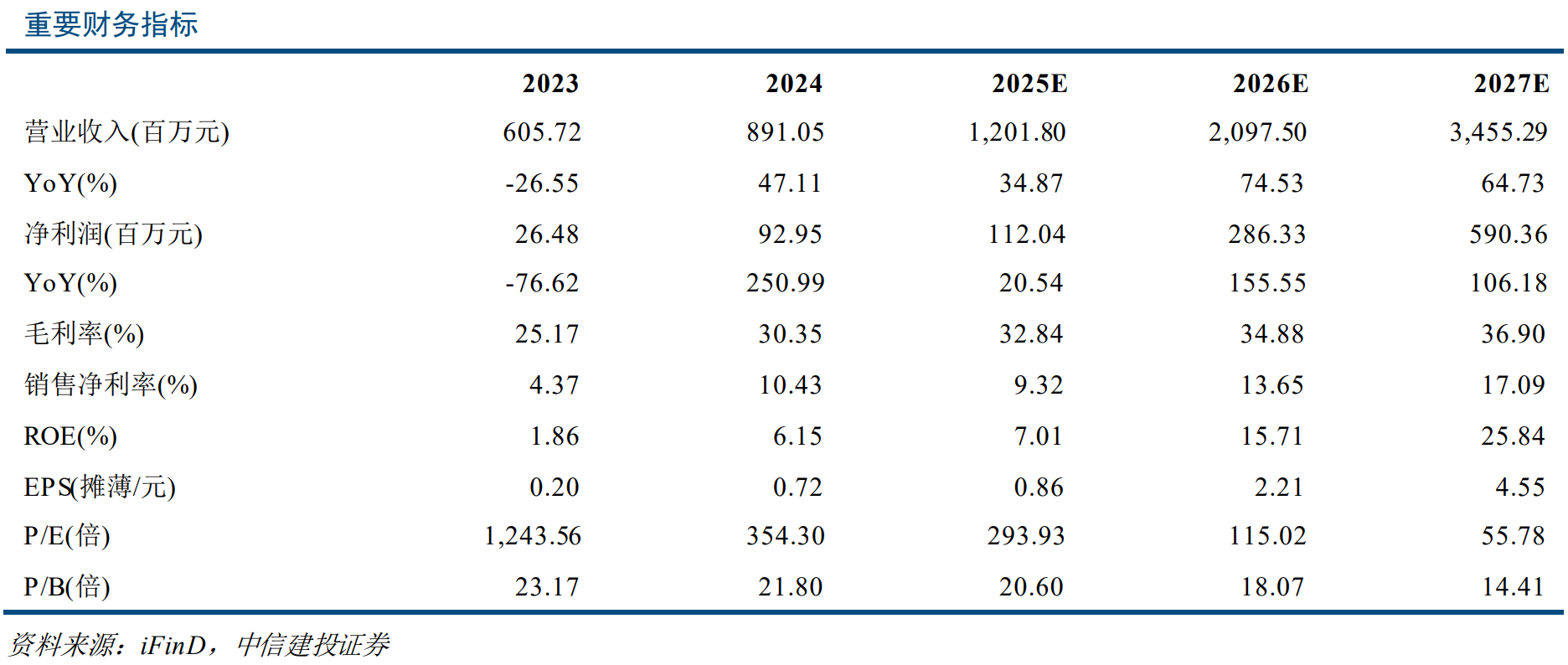 杨伟松预计公司2025-2027年实现归母净利润1.12/2.86/5.90亿元,同比增长20.54%/155.55%/106.18%,对应PE分别为294/115/56倍。