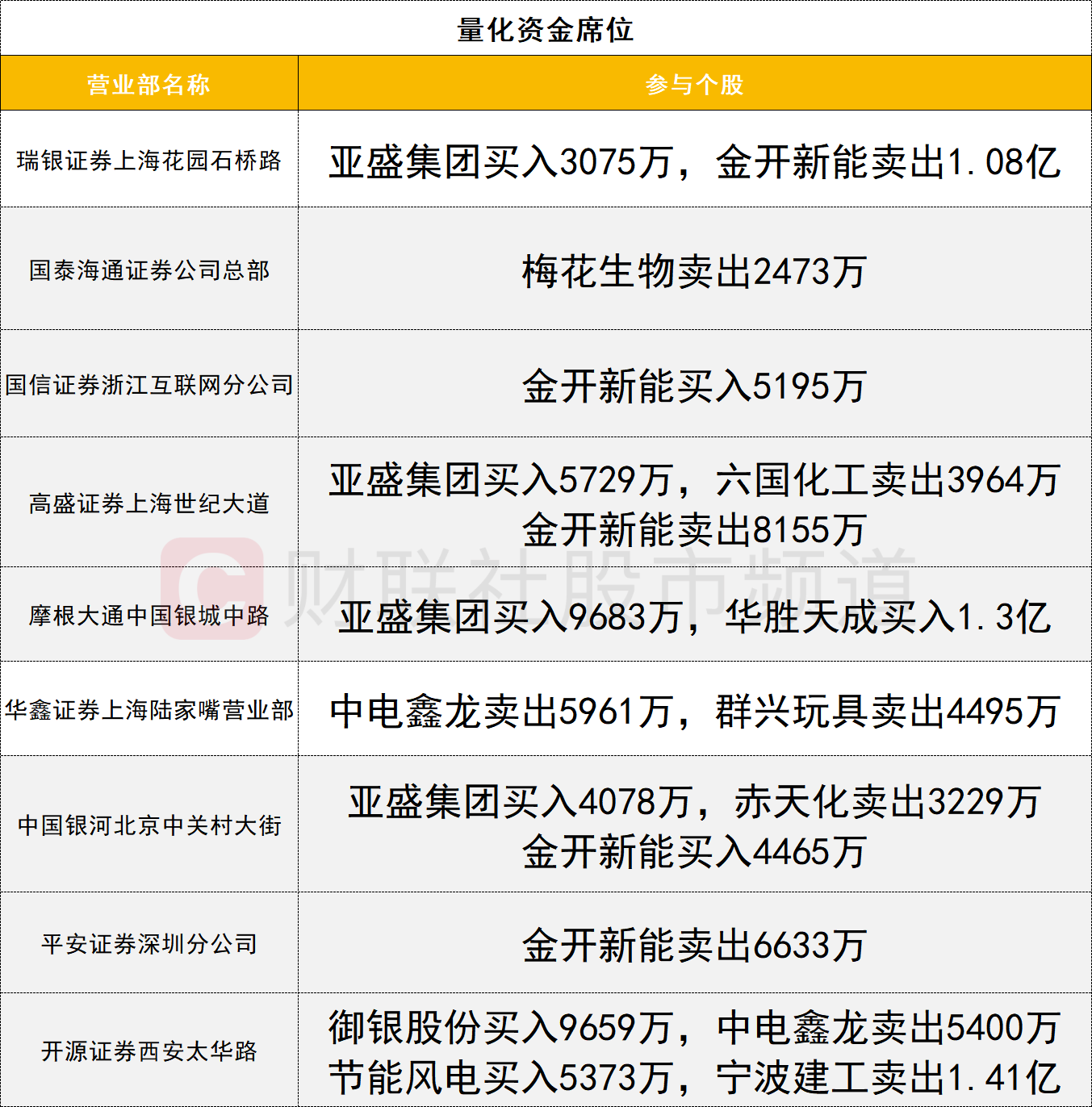 量化资金活跃度有所降低,华为算力人气股华胜天成冲高回落,获一家量化资金(摩根大通中国银城中路)买入1.3亿。亚盛集团获四家量化资金(瑞银证券上海花园石桥路、高盛证券上海世纪大道、摩根大通中国银城中路、中国银河北京中关村大街)合计买入2.25亿。