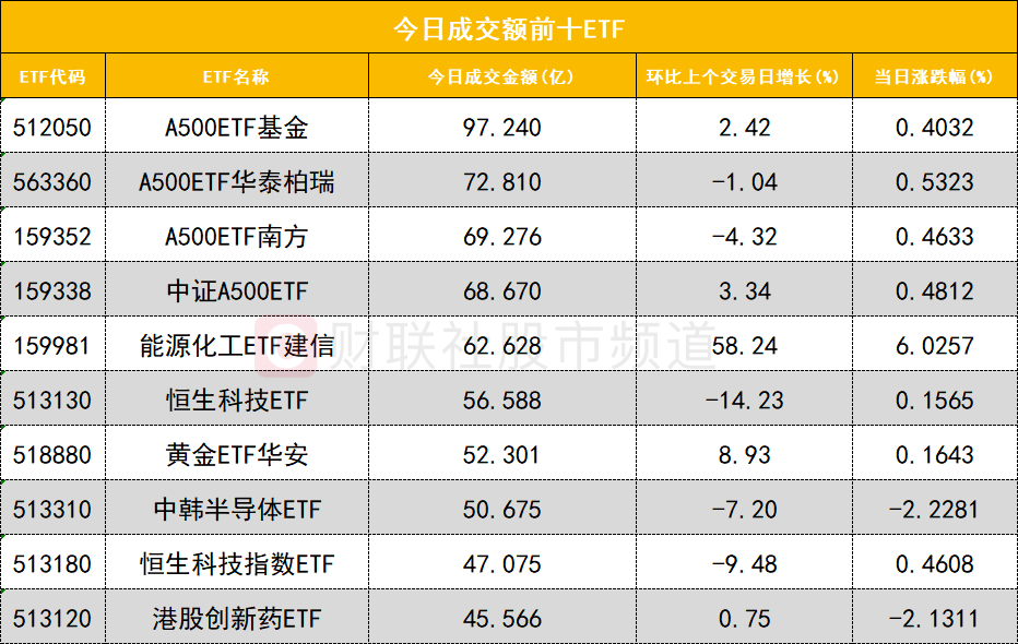从成交额前十的ETF来看,A500ETF基金(512050)成交额位居首位,A500ETF华泰柏瑞(563360)成交额位居次席。