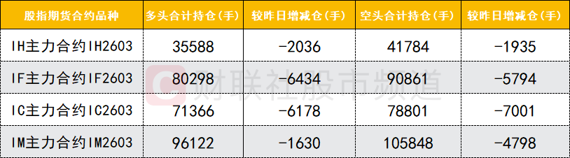 四大期指主力合约中,IH、IF、IC、IM合约多空双方均减仓,IM合约空头减仓数量较多。