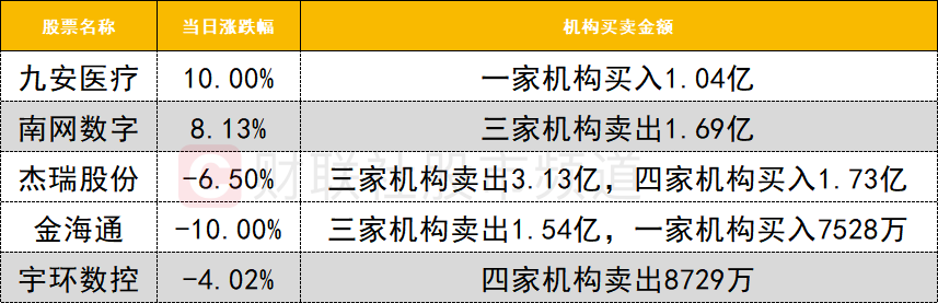 今日龙虎榜机构活跃度明显降低,九安医疗强势涨停,获一家机构买入1.04亿。燃气轮机概念集体下挫,杰瑞股份遭三家机构卖出3.13亿,同时获四家机构买入1.73亿。