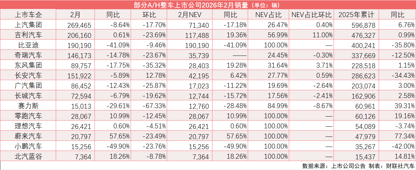 紧随其后的吉利汽车2月销量达20.6万辆,同比微增0.6%;1-2月累计销量47.6万辆,同比增长1%。2月,吉利汽车新能源销量11.7万辆,同比增长19%,占比达57%。吉利汽车2月海外销量为6.1万辆,同比实现翻倍增长。