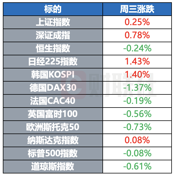 全球主要指数周三涨跌互现,美股三大指数涨跌不一,道指跌0.61%,纳指微涨0.08%,标普500指数微跌0.08%。