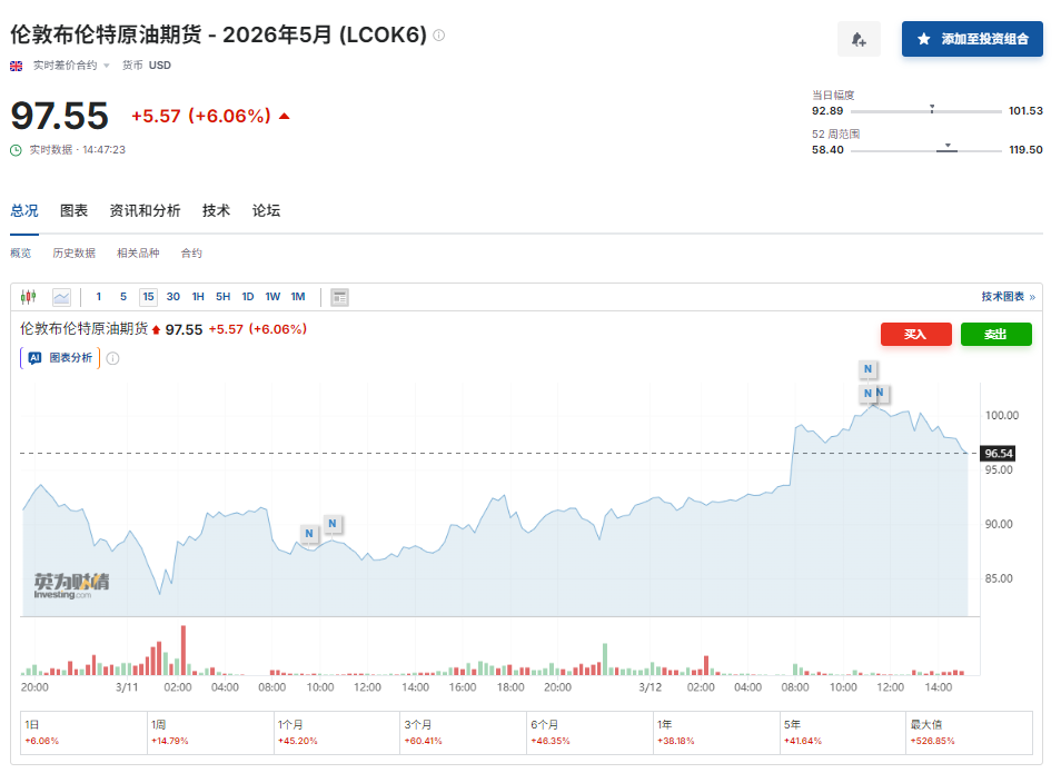 然而,周四亚洲时段,因最新进展表明,来自伊朗的报复性袭击正在增加,悲观情绪再度加剧,国际油价也再次强势升破了100美元/桶关口。截至发稿,布伦特原油期货价格小幅回落至98美元附近。