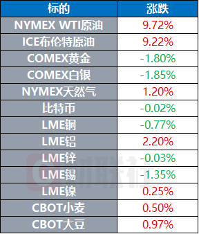 纽约商品交易所4月交货的轻质原油期货价格上涨8.48美元,收于每桶95.73美元,涨幅为9.72%;5月交货的伦敦布伦特原油期货价格上涨8.48美元,收于每桶100.46美元,涨幅为9.22%。