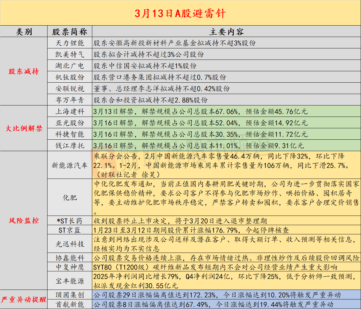 导读:财联社3月13日投资避雷针,近日A股及海外市场潜在风险事件如下。国内经济信息方面包括:1)1-2月中国新能源市场乘用车累计零售量为106万辆,同比下滑25.7%;2)中化化肥发通知要求客户不得参与化肥市场炒作;公司方面重点关注包括:1)ST京蓝1月23日至3月12日期间股价累计涨幅176.79%,今起停牌核查;2)光迅科技表示,注意到网络出现涉及公司送样及潜在客户、取得大额订单、收入预测等相关信息,经核实均为不实信息;海外市场重点关注包括:1)伊最高领袖说继续关闭霍尔木兹海峡;2)美股三大指数集体收跌,芯片股普跌。