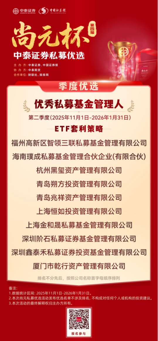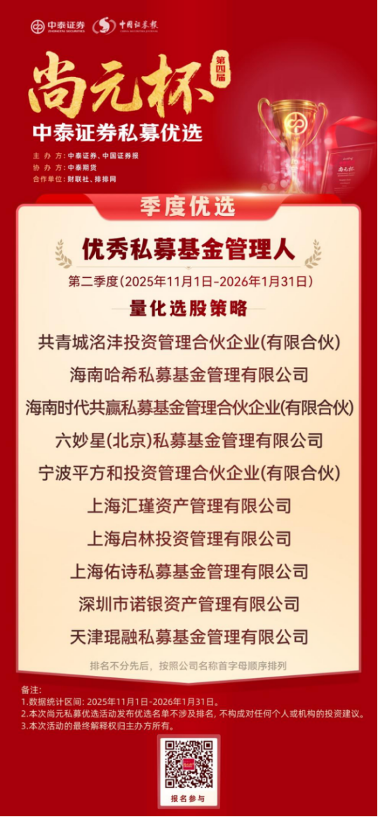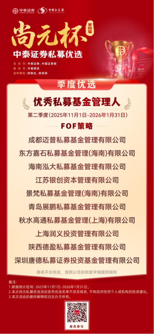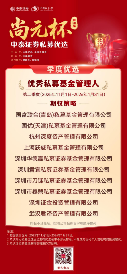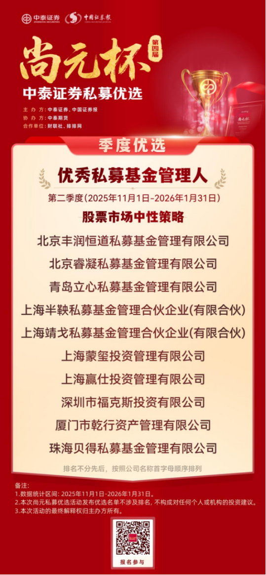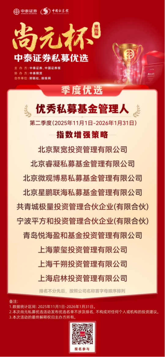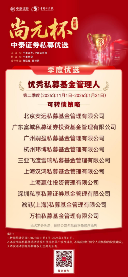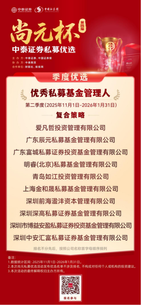 恰逢证监会主席吴清近期就私募基金行业发展作出明确定调,提出完善私募基金 “1+N+X” 制度体系,推动行业在规范中发展、在发展中提升,这一监管导向也与中泰证券 “尚元杯” 始终坚持合规优先、严控风险、聚焦长期业绩的评选理念高度契合,为本次私募优选活动赋予了更鲜明的行业现实意义。