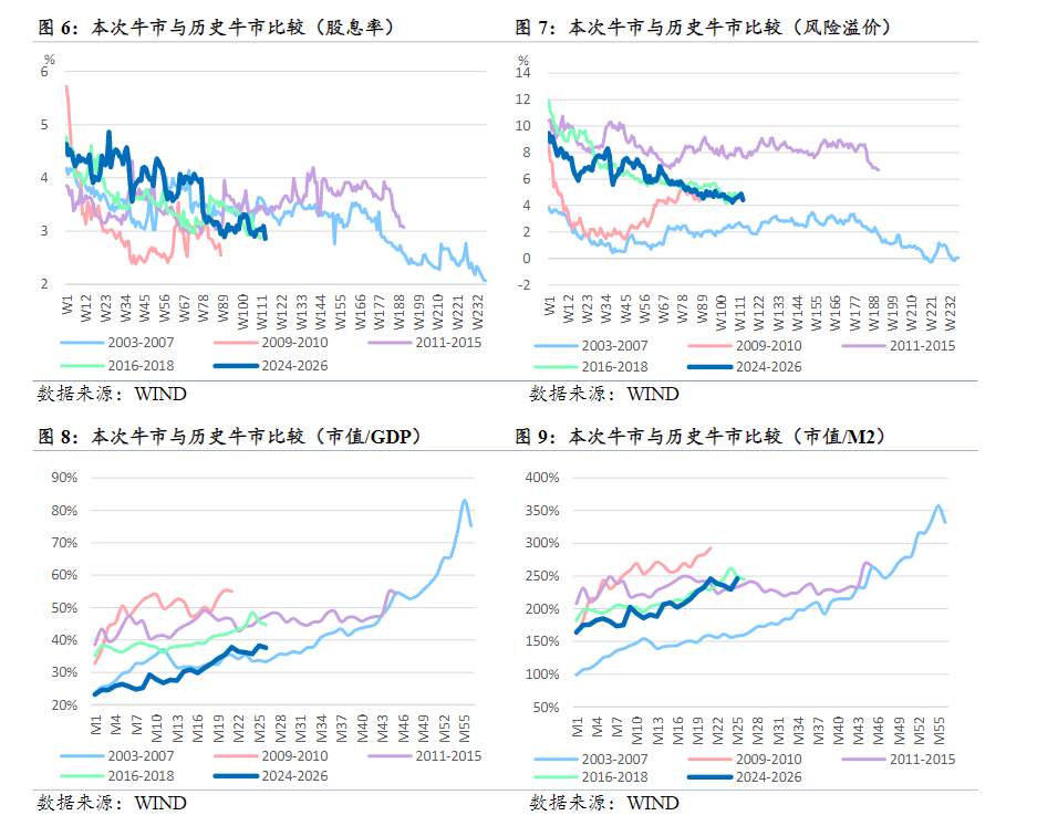 民银国际还通过7大指标,将目前的牛市进度与新世纪年以来的4次牛市平均水平进行比较。发现分别从指数绝对水平、市盈率、市净率、股息率、风险溢价来看,距离历史牛市平均水平仍分别有33.0%、24.0%、66.4%、8.3%、14.8%的空间。总市值占GDP和M2的比重相对于牛市平均水平则分别还有20和37个百分点的提升空间。