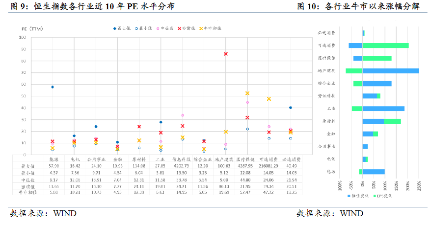 从行业视角看,目前估值相较于牛市初期估值修复明显行业包括原材料、能源、金融、信息科技、工业和综合企业。因业绩明显改善而导致估值被动下降的行业则包括医疗保健和非必需性消费。估值相对于10年中值明显偏高的行业包括原材料、工业、综合企业、地产建筑业,明显偏低的行业则包括信息科技、医疗保健、非必需性消费和必需性消费。