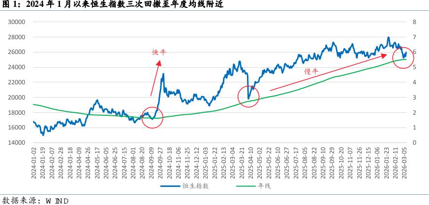 财联社3月13日讯(编辑 胡家荣)自2024年1月22日触及阶段低点以来,港股市场开启新一轮上行周期。经历初期高波动阶段后,当前已步入稳健上涨的“慢牛”格局。恒生指数近期回调至250日均线后企稳,历史经验表明,此前两次年线支撑均孕育新一轮升势。