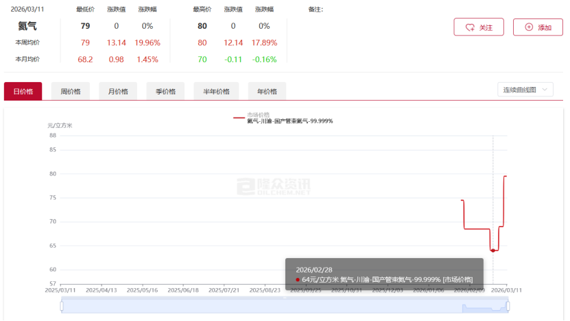 根据隆众资讯数据统计,截至3月12日,国产管束氦气市场均价已涨至79.5元/立方米,较2月28日的64元/立方米,上涨24.22%。