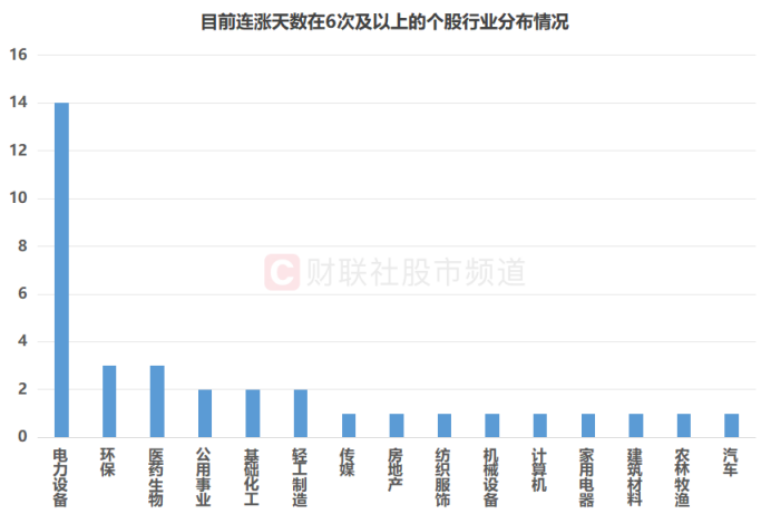③目前连涨天数在6次及以上的个股中,电力设备股比例最高,占比达40%。