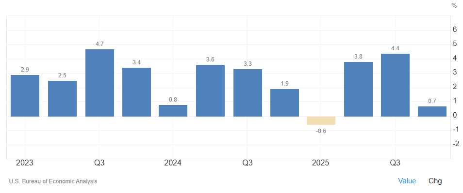 同一时间公布的GDP报告显示,美国2025年第四季度实际GDP年化环比增长率为0.7%,较1.4%的初值大幅下修,去年第三季度这一数字为4.4%。