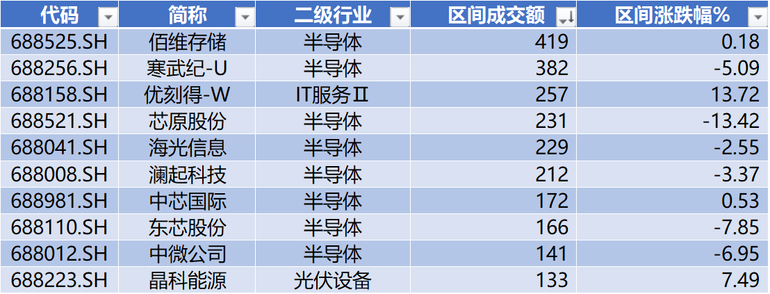 上表是本周成交额(亿)前十公司,分别为:佰维存储、寒武纪-U、优刻得-W、芯原股份、海光信息、澜起科技、中芯国际、东芯股份、中微公司、晶科能源。