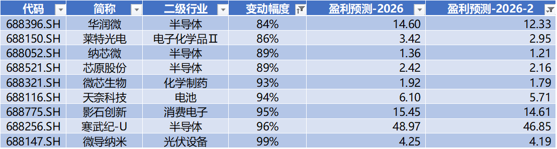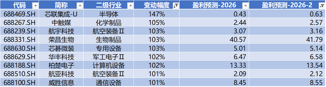 上表是本周盈利预测(规模净利润预测值)中值上调/下移的公司,其中上调有9家,本文选取其中幅度最大的前十家(若不足十家则按实际数量列示),分别为:芯联集成-U、中触媒、航宇科技、荣昌生物、芯碁微装、华丰科技、柏楚电子、航亚科技、威胜信息。
