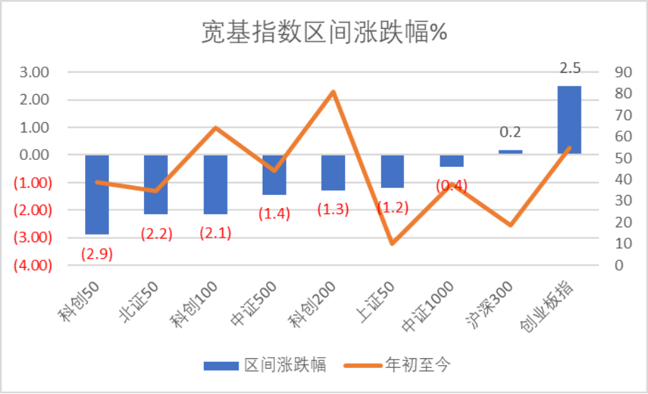 ①本周,A股主要宽基指数呈现分化,仅有沪深300与创业板指正收益,科创50、科创100、科创200分别跌2.9%、2.1%、1.3%。