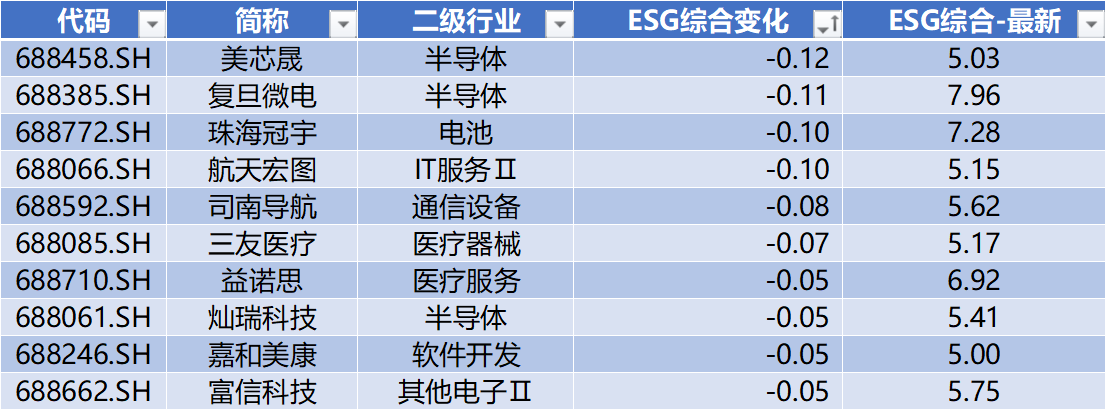 上表是ESG评分变化下降的前十家公司,分别为:美芯晟、复旦微电、珠海冠宇、航天宏图、司南导航、三友医疗、益诺思、灿瑞科技、嘉和美康、富信科技。