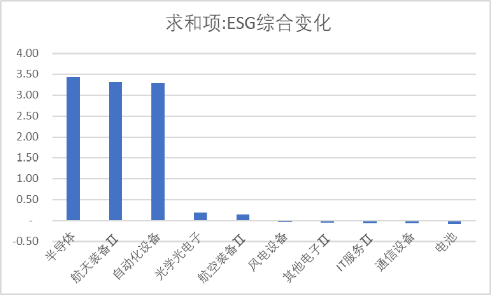 上图是本周ESG评分变化行业分布,本文统计了排名最高和最低的5个行业,本周ESG评分变化排名变化最大的细分行业:半导体、航天装备、自动化设备。