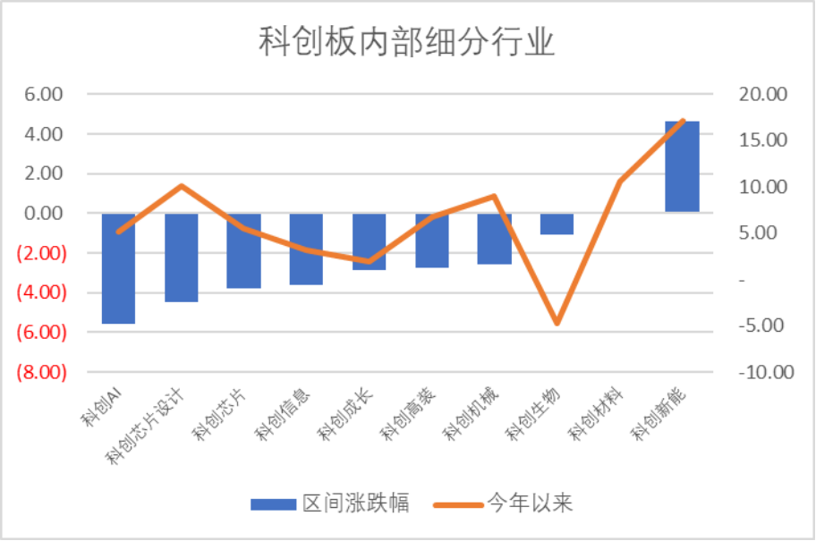 如上图所示,本周科创板内部呈现分化,新能源是少数正收益板块,其次芯片设计与AI板块。