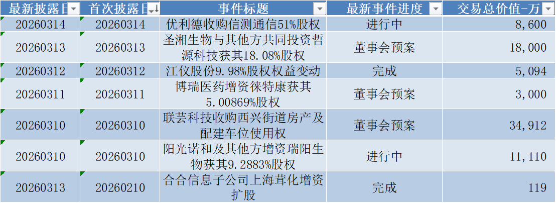 3、本周科创板并购最新进展共11条,其中7条属于本周首次披露:优利德收购信测通信51%股权、圣湘生物与其他方共同投资哲源科技获其18.08%股权、江仪股份9.98%股权权益变动、博瑞医药增资徕特康获其5.00869%股权、联芸科技收购西兴街道房产及配建车位使用权、阳光诺和及其他方增资瑞阳生物获其9.2883%股权、合合信息子公司上海茸化增资扩股。