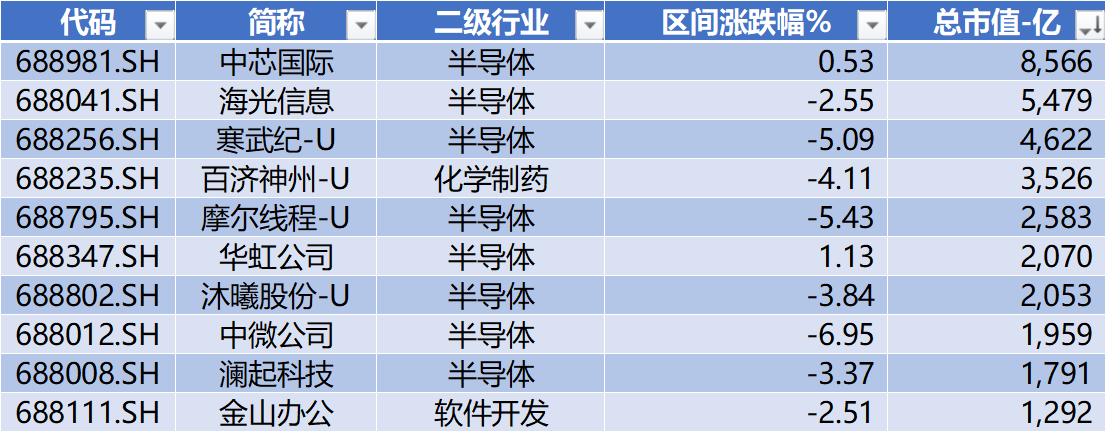 上图是本周科创板前十大权重公司呈现大部分下跌,华虹公司与中芯国际正收益,中微公司居末。