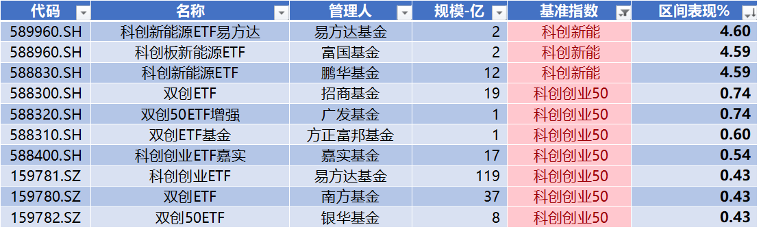 上表是本周市场表现按照降序排列的科创板ETF基金,本文选取前十名。本周科创板ETF中,新能源与双创50主题ETF表现居前。