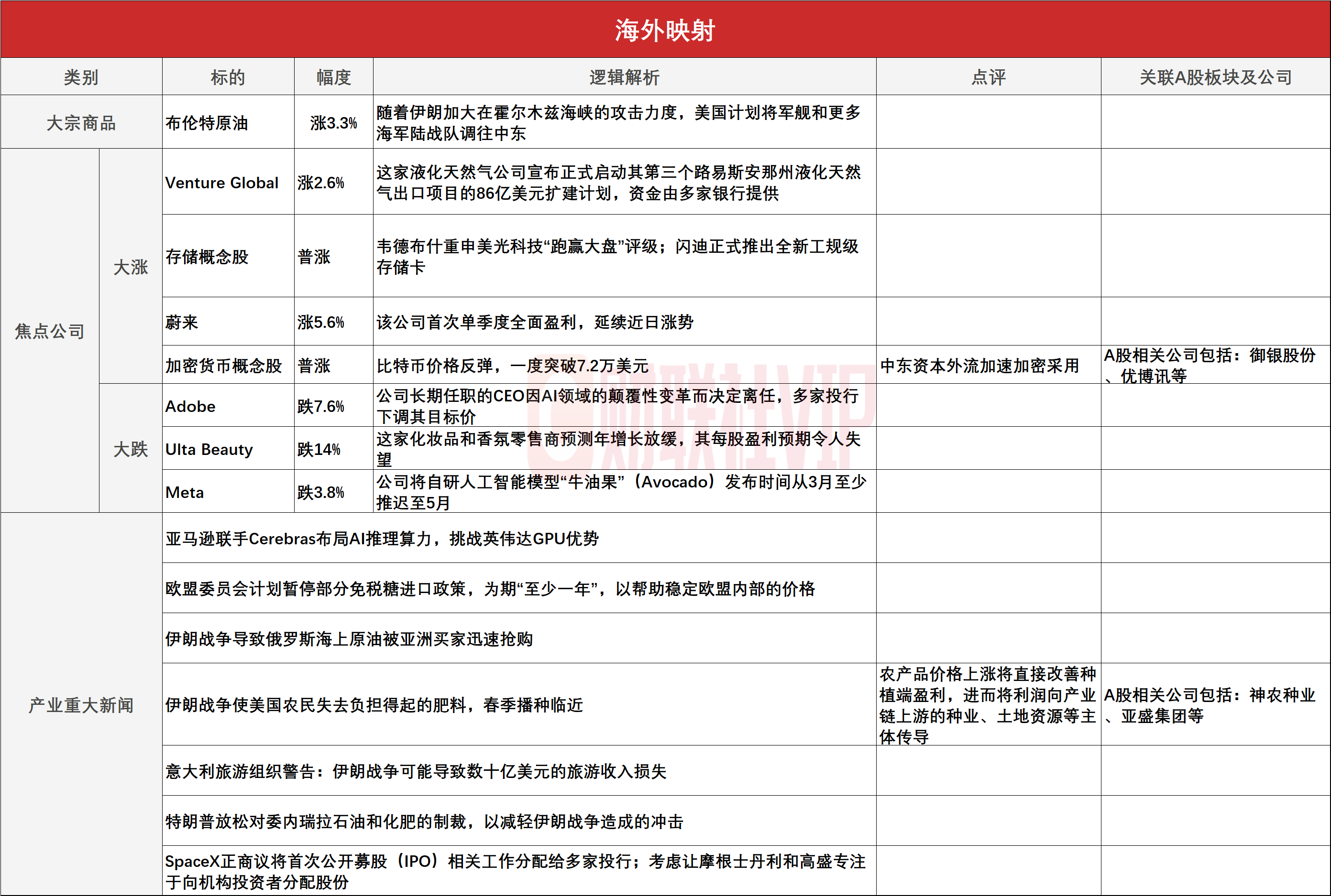 2、伊朗战争使美国农民失去负担得起的肥料,春季播种临近,农产品价格上涨将直接改善种植端盈利,进而将利润向产业链上游的种业、土地资源等主体传导,A股相关公司包括:神农种业、亚盛集团等。