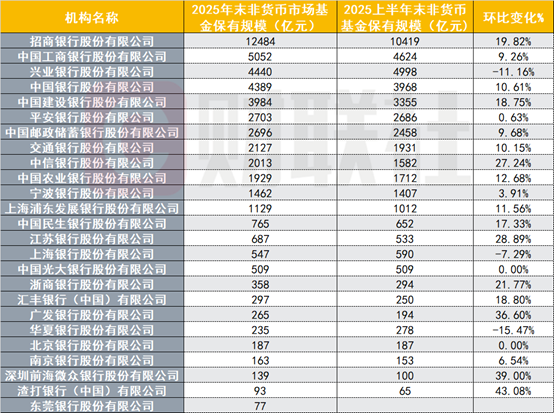 榜单中,共有25家银行进入公募代销规模前100名,25家机构在2025年末合计保有非货币市场基金4.87万亿元,与2025年上半年末进入百强的银行机构相比,小幅增长10.68%。
