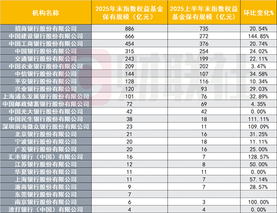 不过,银行在股票指数基金代销领域奋起直追。2025年末保有股票型指数基金3578亿元,环比增长34.16%,部分银行增长超过100%。