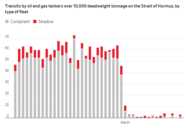 法国兴业银行估计,当前通过霍尔木兹海峡的石油流量约为50万桶/日,这意味着通过该海峡的石油量较过往平均流量减少了1950万桶/日。即便考虑到通过区域管道的绕行运输,每天仍有约1700万桶的石油无法正常运输。