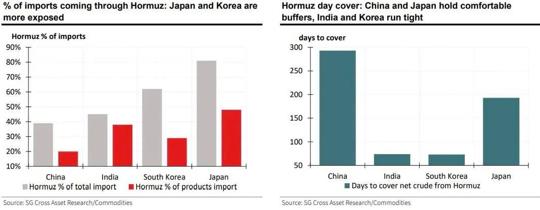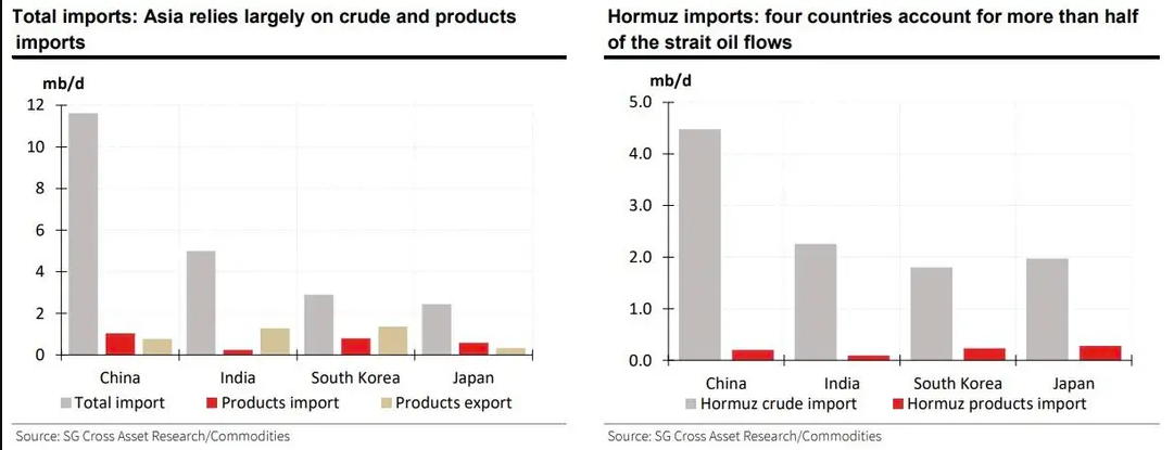 法国兴业银行指出,亚洲经济体面临的问题可能更为严峻,因为该地区通过霍尔木兹海峡的进口量超过1300万桶/日——约占该地区总进口量的50%,其中中国、印度、韩国和日本是四个最大的买家。