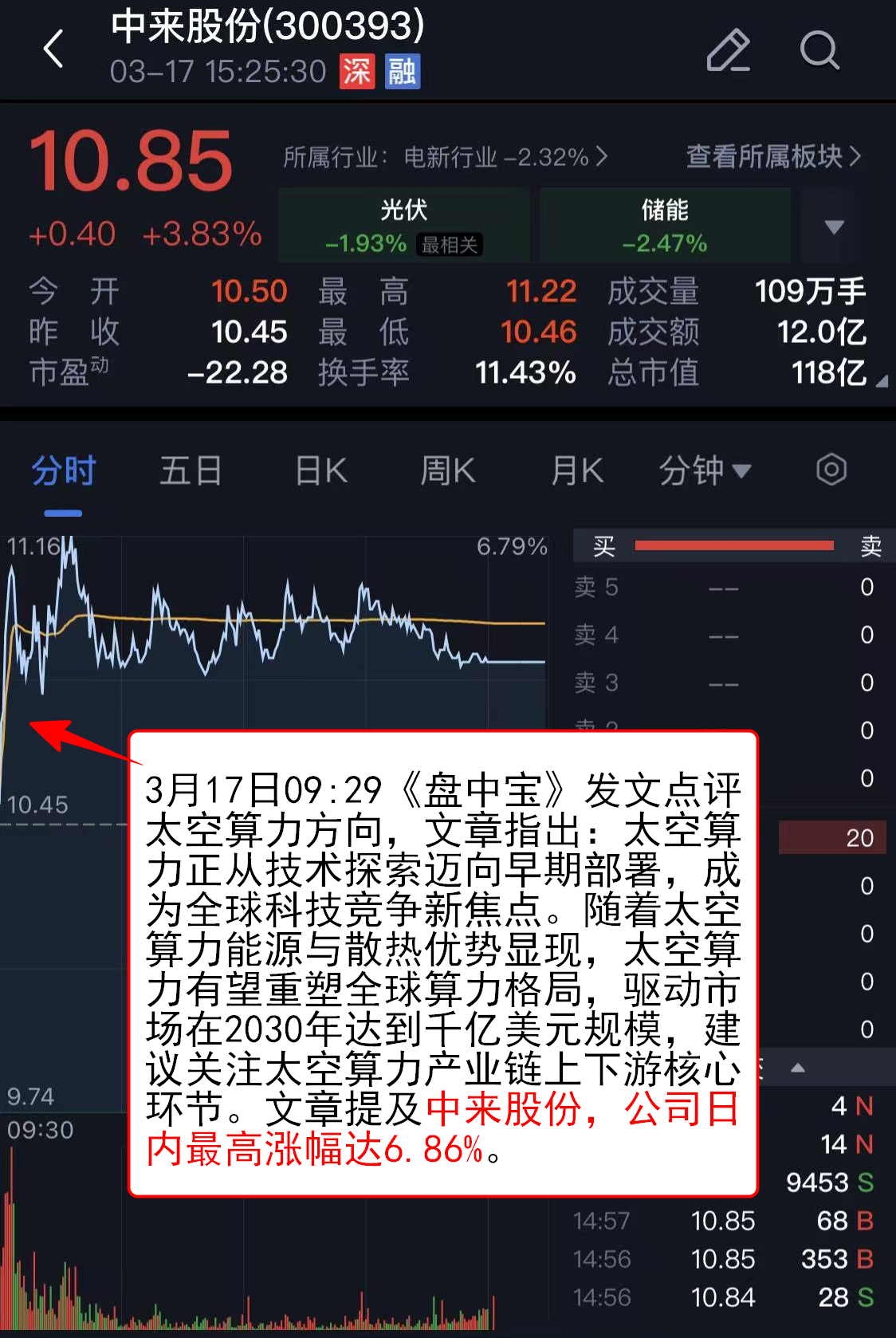 3月17日09:29《盘中宝》发文点评太空算力方向,文章指出:太空算力正从技术探索迈向早期部署,成为全球科技竞争新焦点。随着太空算力能源与散热优势显现,太空算力有望重塑全球算力格局,驱动市场在2030年达到千亿美元规模,建议关注太空算力产业链上下游核心环节。文章提及中来股份,公司日内最高涨幅达6.86%。