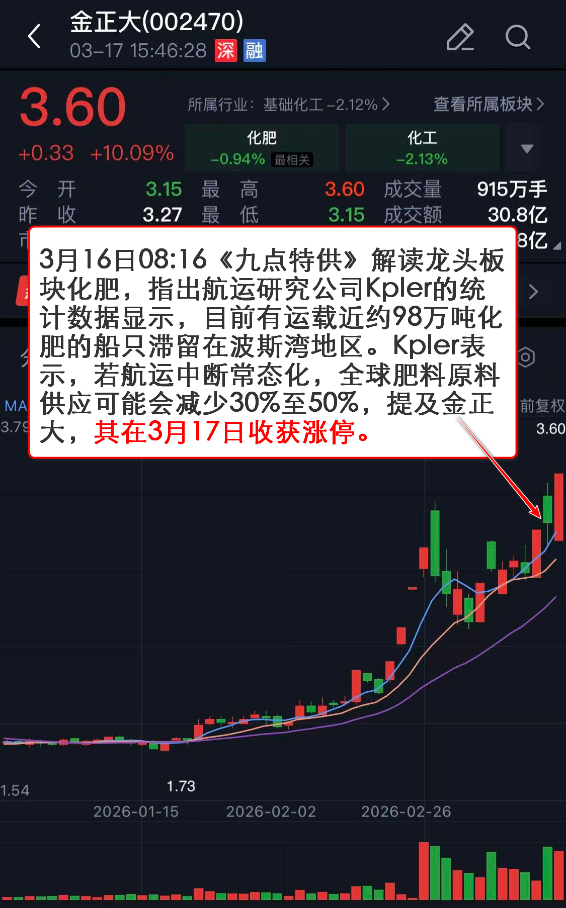 3月16日08:16《九点特供》解读龙头板块化肥,指出航运研究公司Kpler的统计数据显示,目前有运载近约98万吨化肥的船只滞留在波斯湾地区。Kpler表示,若航运中断常态化,全球肥料原料供应可能会减少30%至50%,提及金正大,其在3月17日收获涨停。