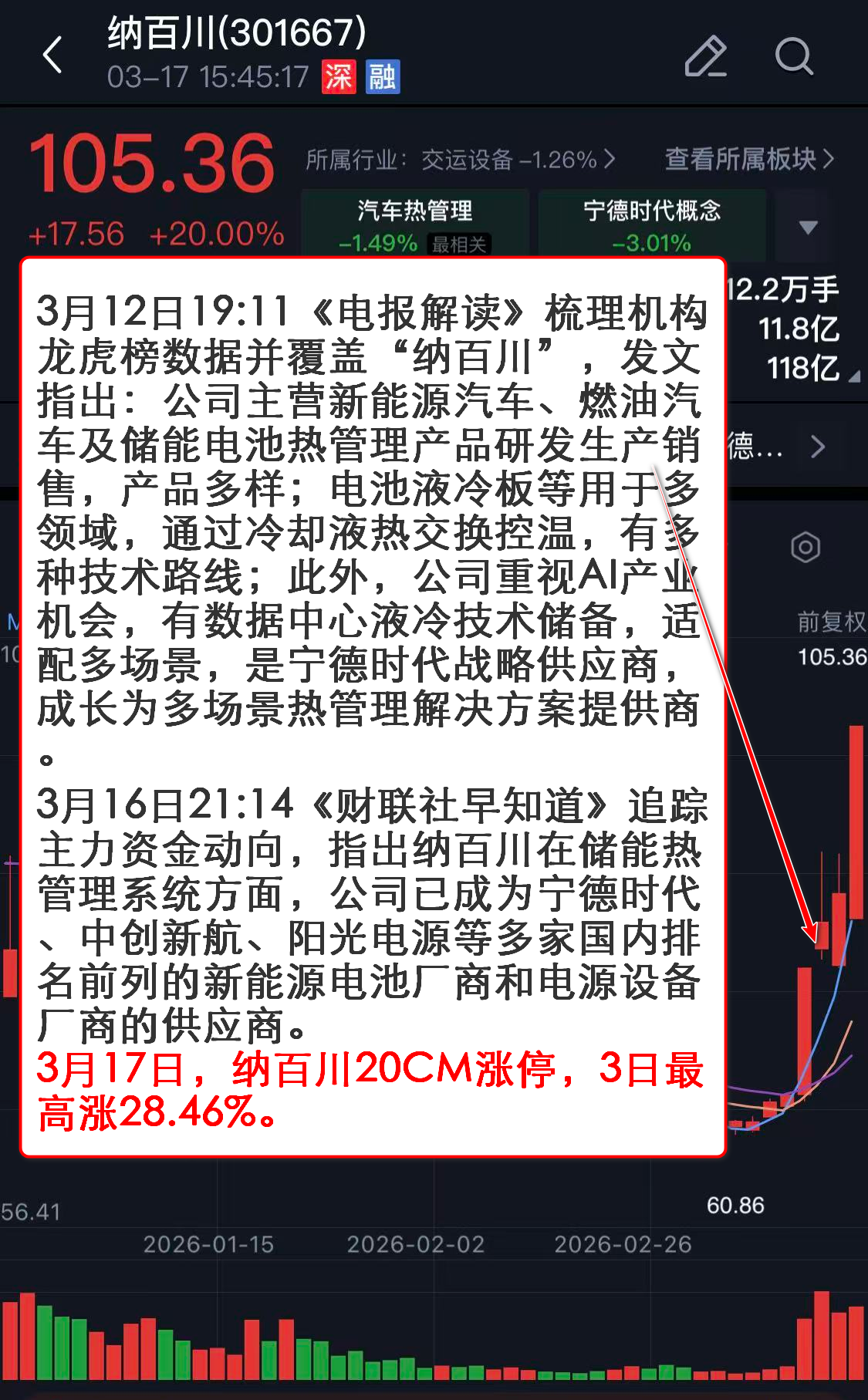3月16日21:14《财联社早知道》追踪主力资金动向,指出纳百川在储能热管理系统方面,公司已成为宁德时代、中创新航、阳光电源等多家国内排名前列的新能源电池厂商和电源设备厂商的供应商。