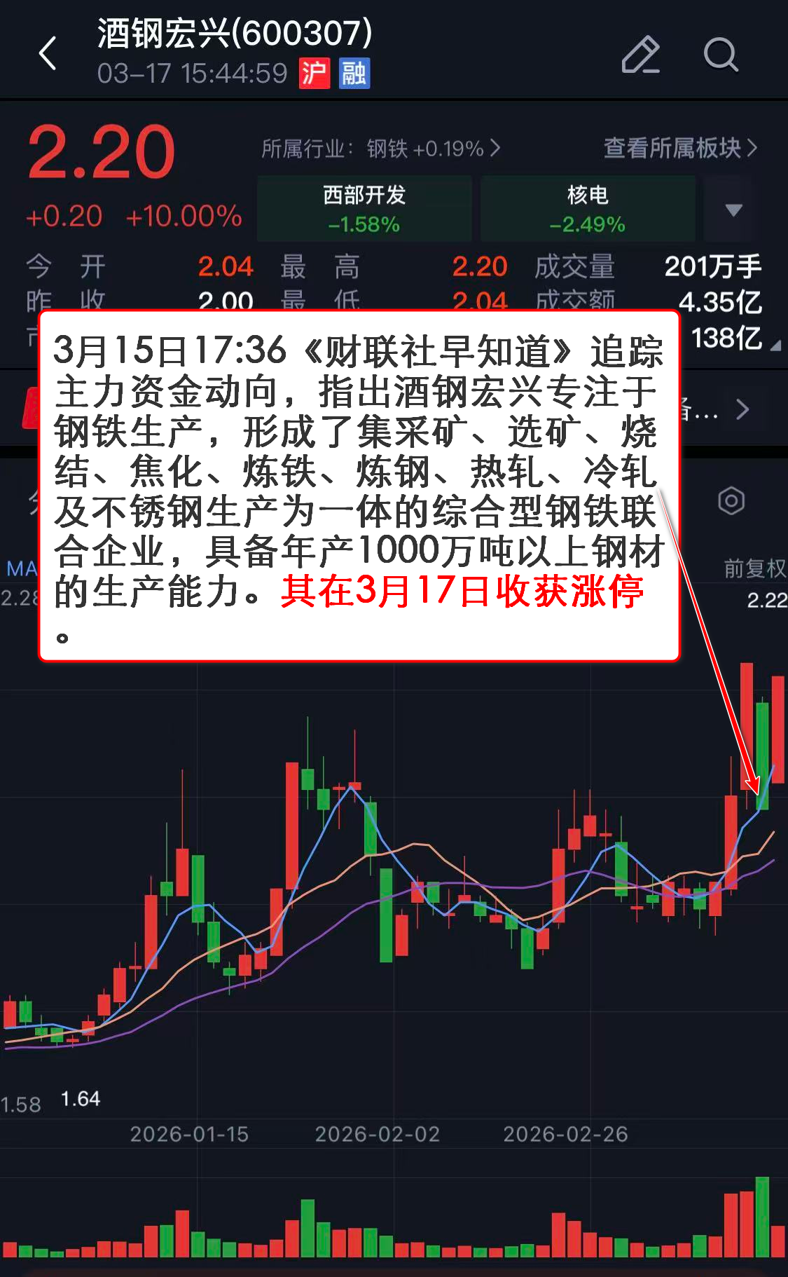 3月15日17:36《财联社早知道》追踪主力资金动向,指出酒钢宏兴专注于钢铁生产,形成了集采矿、选矿、烧结、焦化、炼铁、炼钢、热轧、冷轧及不锈钢生产为一体的综合型钢铁联合企业,具备年产1000万吨以上钢材的生产能力。其在3月17日收获涨停。