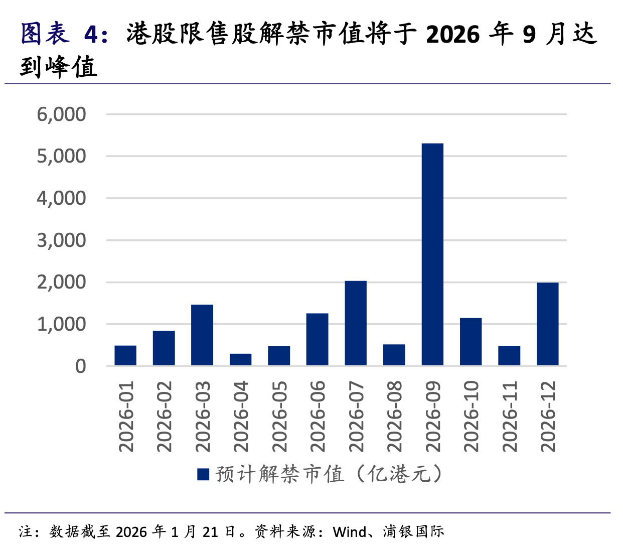 浦银国际研报指出,2026年全年有6个月的月度解禁规模超过1000亿港元。其中,9月将成为全年的“风暴眼”,单月解禁市值预计高达5309亿港元,占全年总量的32.6%。这一单月规模甚至超过了2025年大半个月的IPO募资总和。如此密集的筹码释放,在港股历史上极为罕见。