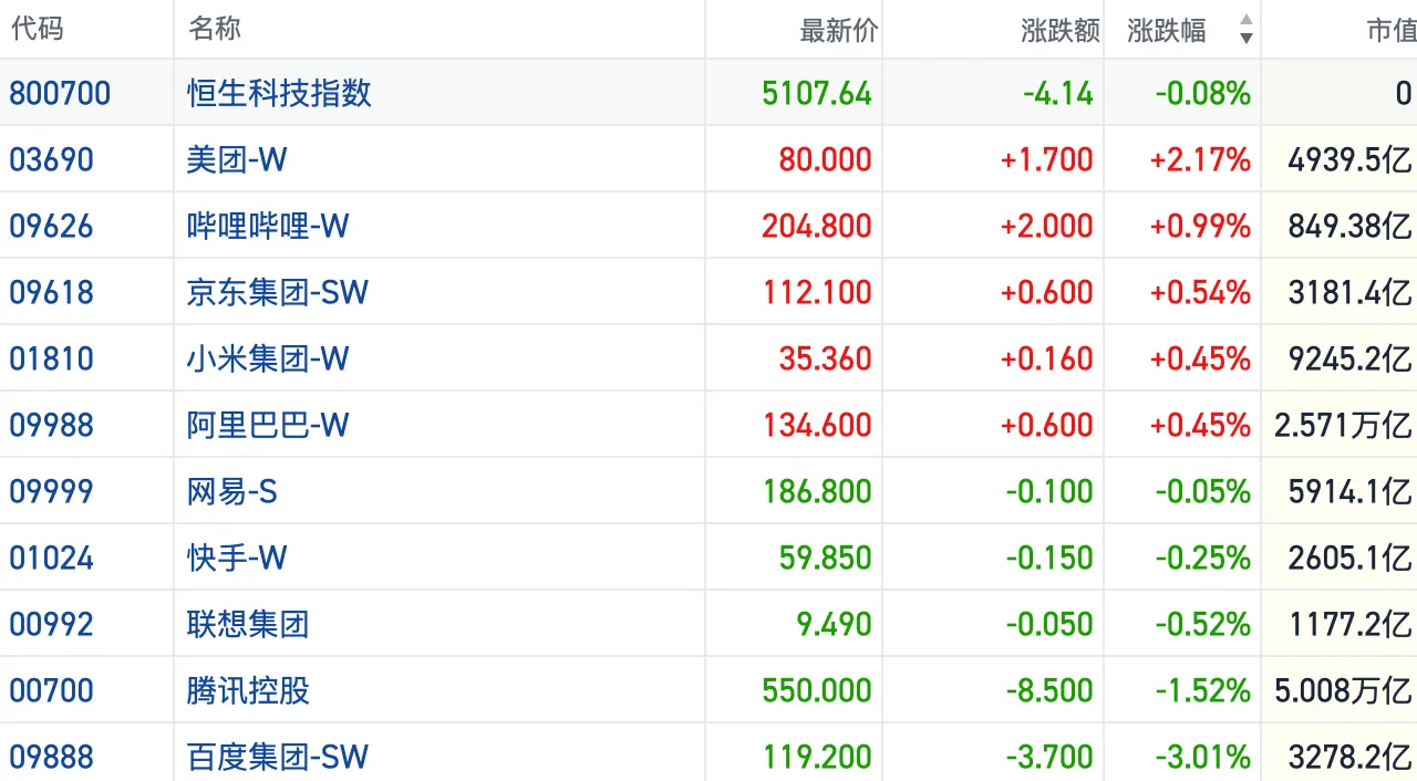 盘面上,今日大型科网股涨跌分化,百度跌3%,腾讯跌1.5%,快手、网易飘绿,美团仍涨超2%,京东、小米、阿里巴巴小幅上涨。