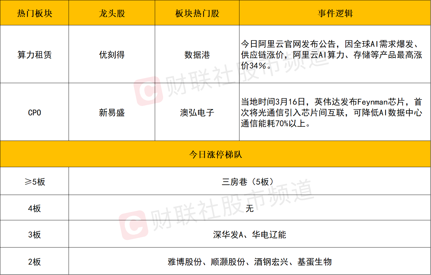 算力租赁概念股午后进一步加强,美利云、云赛智联、数据港等涨停,优刻得、青云科技、东方国信、顺网科技等个股涨幅居前。消息面上,今日阿里云官网发布公告,因全球AI需求爆发、供应链涨价,阿里云AI算力、存储等产品最高涨价34%。